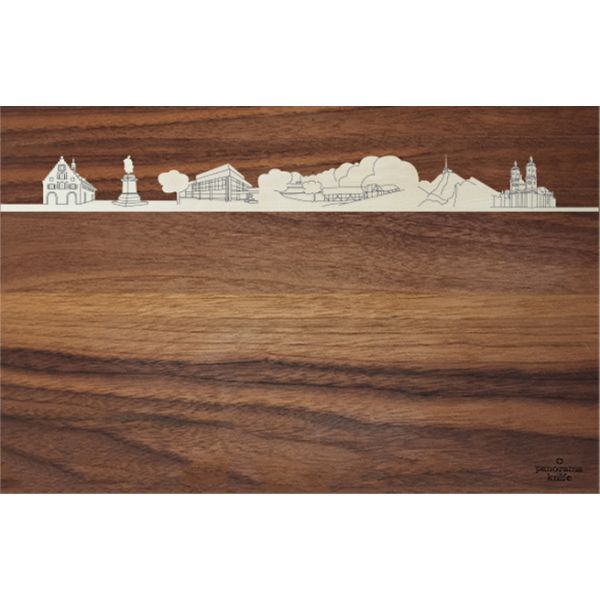 Holzschneidebrett aus Nussbaum mit Intarsie aus hellem Ahorn. Bitte von Hand abwaschen und hin und wieder mit etwas Lebensmittelöl einreiben, dann bleibt es ewig schön.
