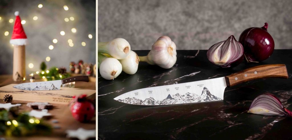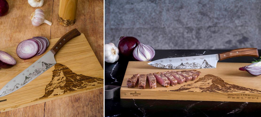 Nous sommes heureux de pouvoir vous présenter notre nouveau couteau de chef PanoramaKnife. Vous connaissez déjà nos couteaux avec le panorama montagneux intégré dans le tranchant – cette fois, nous avons choisi une approche différente : le panorama « Best of Switzerland » apparaît sous forme d’une fine et élégante gravure laser directement sur la lame, conférant au couteau une sobriété moderne et raffinée.